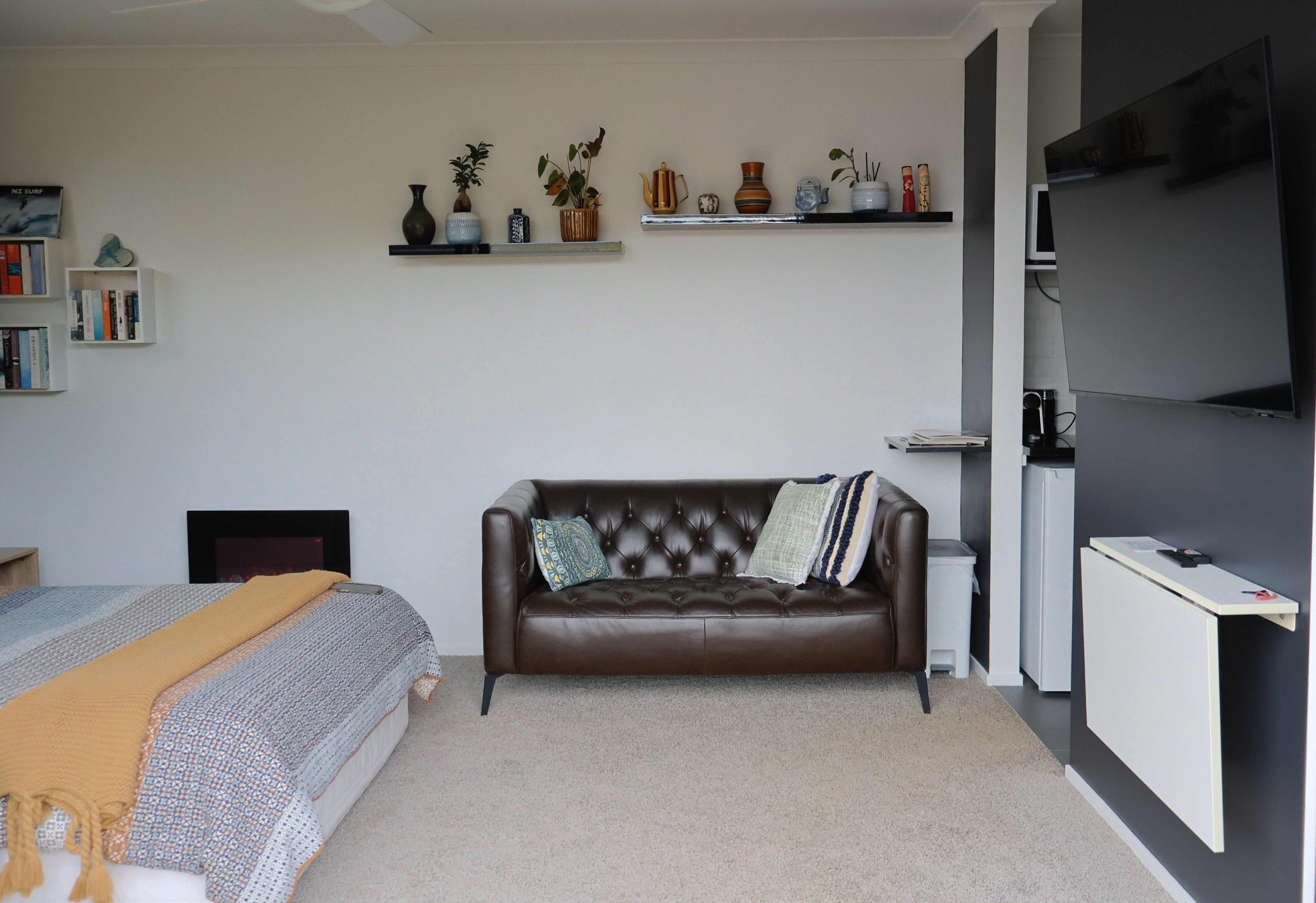 As we are some distance from any restaurants (Raglan is your closest town), we recommend coming prepared so you can embrace this opportunity to feel totally removed from the world! You can take advantage of the barbecue provided, or the studio also features a kitchenette with a single plug-in hob, microwave, fridge, sink and all the basic utensils. Tea and coffee is provided, and our filtered tap water is safe to drink.