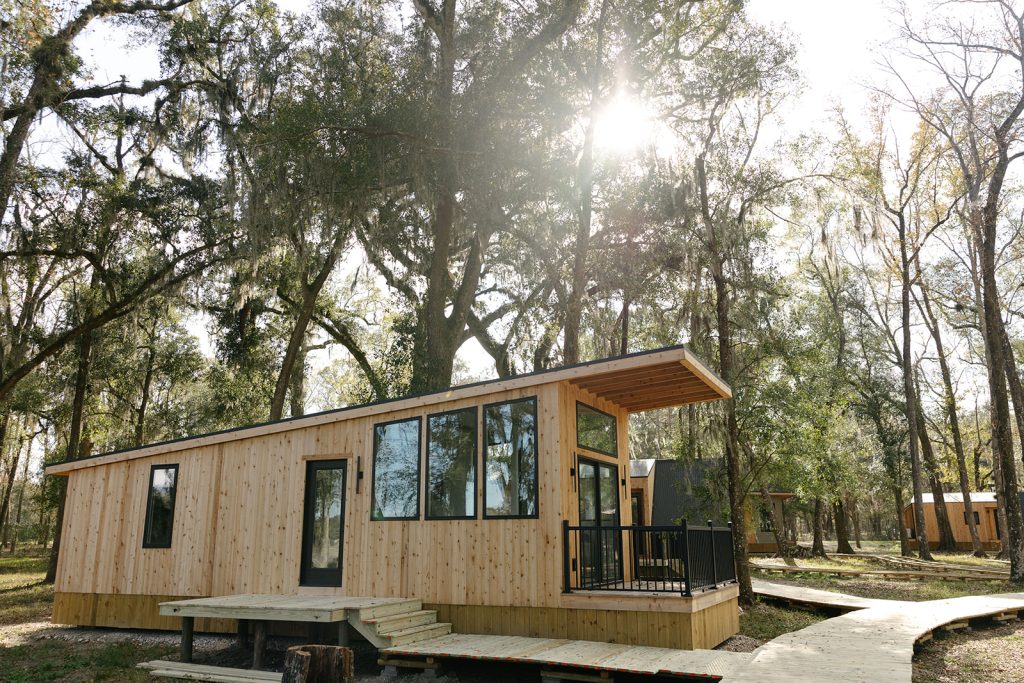 The Egret offers a 400 square foot retreat appointed with a bedroom, living room, king size bed, and bathroom with shower.
