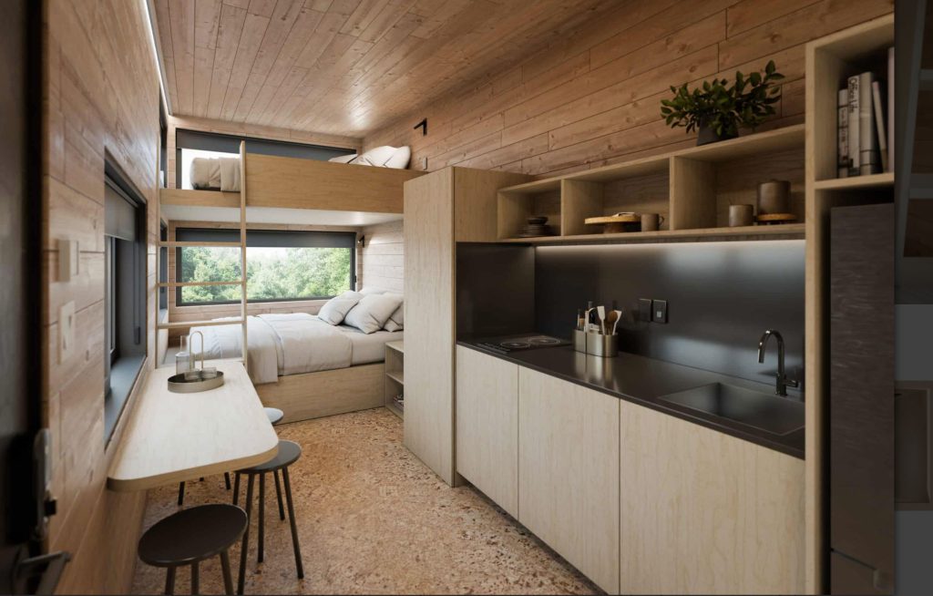 The Nest is a cozy 255 square foot bungalow appointed with a king size bed, a lofted queen size bed, bathroom with shower, and a galley kitchen. The Nest can accommodate up to four guests.