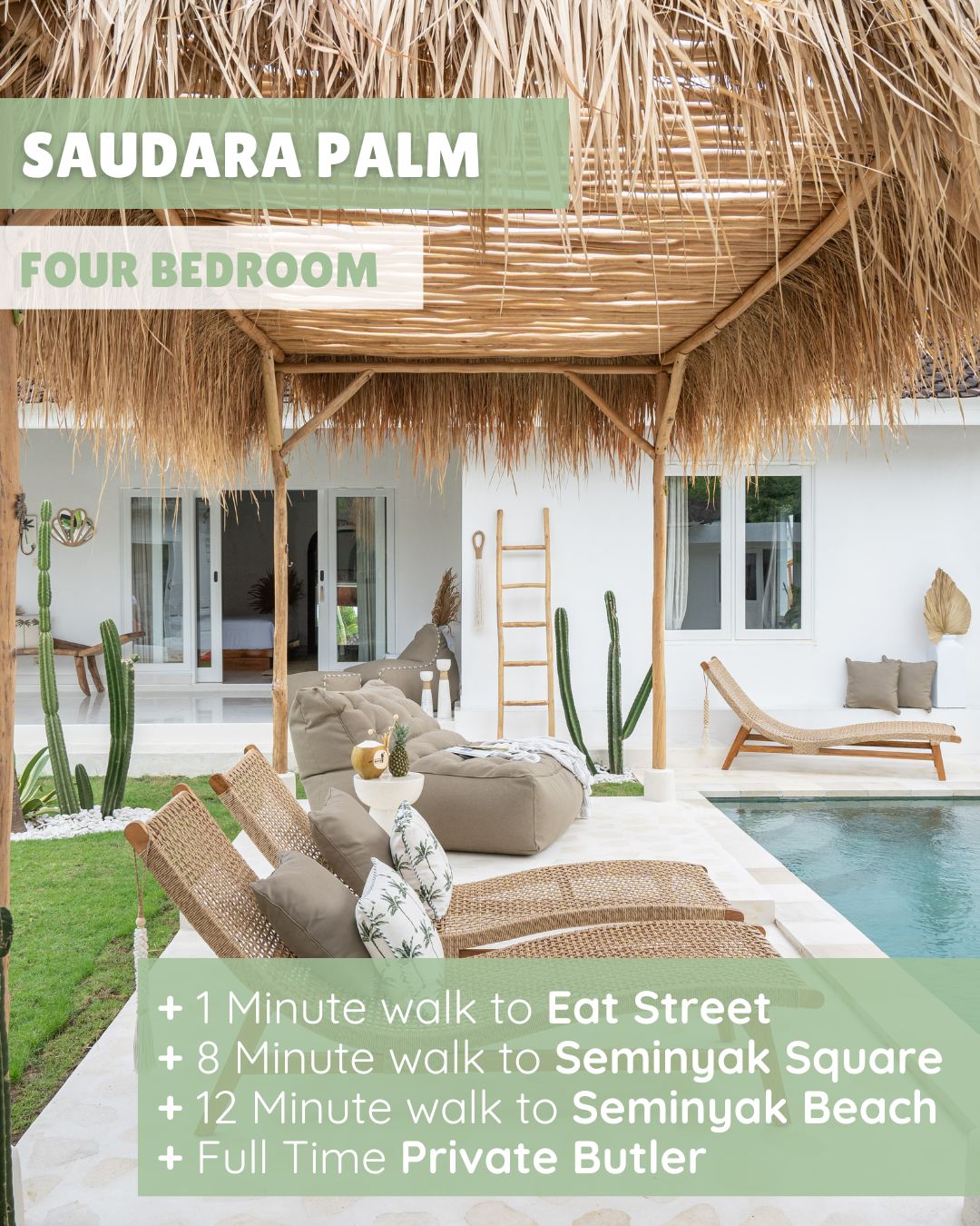 Saudara PALM is your Tropical Escape in Seminyak. Experience the perfect blend of Mediterranean charm and Balinese design at Saudara PALM. We recommend this villa for a maximum of 10 adults or a combination of adults and kids, with our standard pricing including 8 guests.