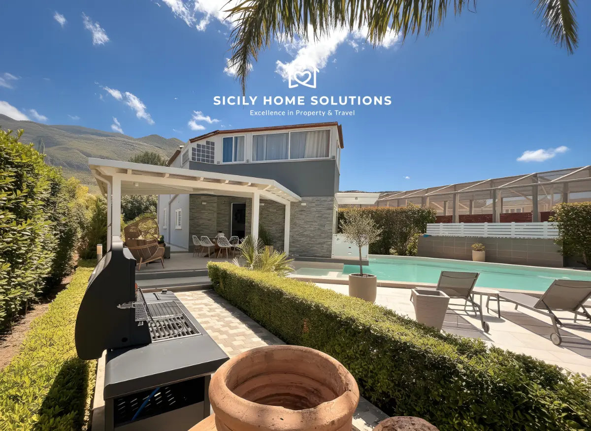 Immagina di svegliarti con il profumo del mare e la vista delle montagne siciliane. Questa elegante villa, immersa nel verde, offre una piscina privata, jacuzzi e un ampio giardino per momenti di puro relax.