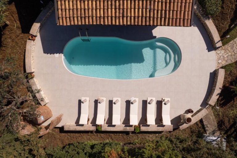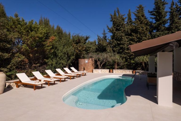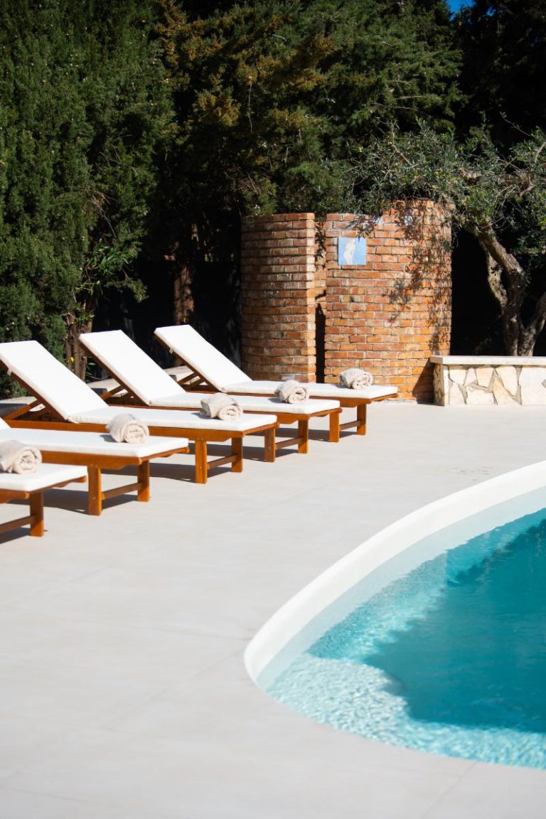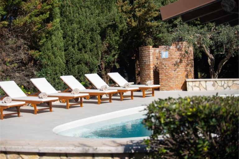 una splendida piscina privata di acqua salata (5×10 m), circondata da solarium con lettini, area barbecue e ampi spazi verdi per vivere momenti di relax assoluto.