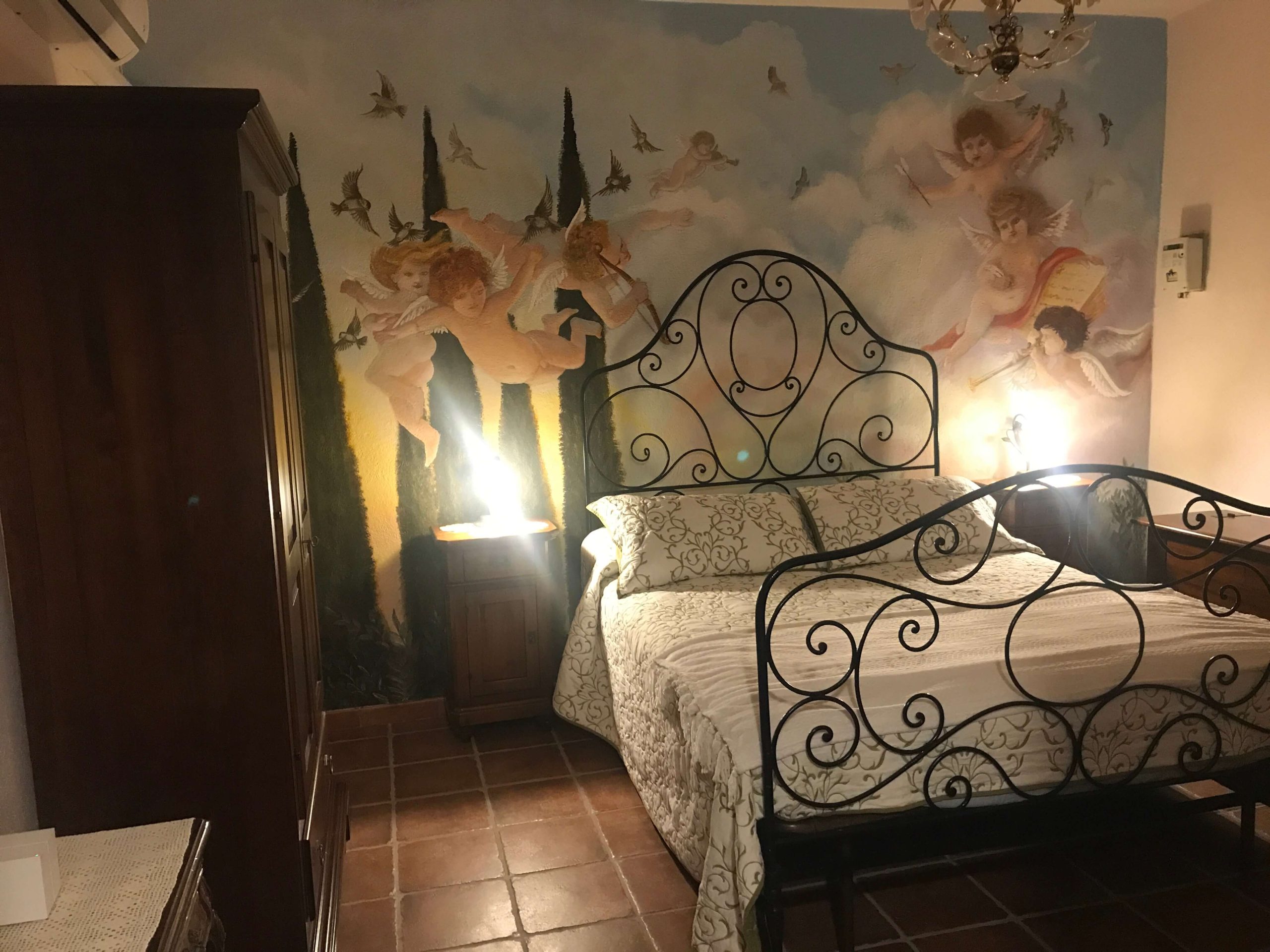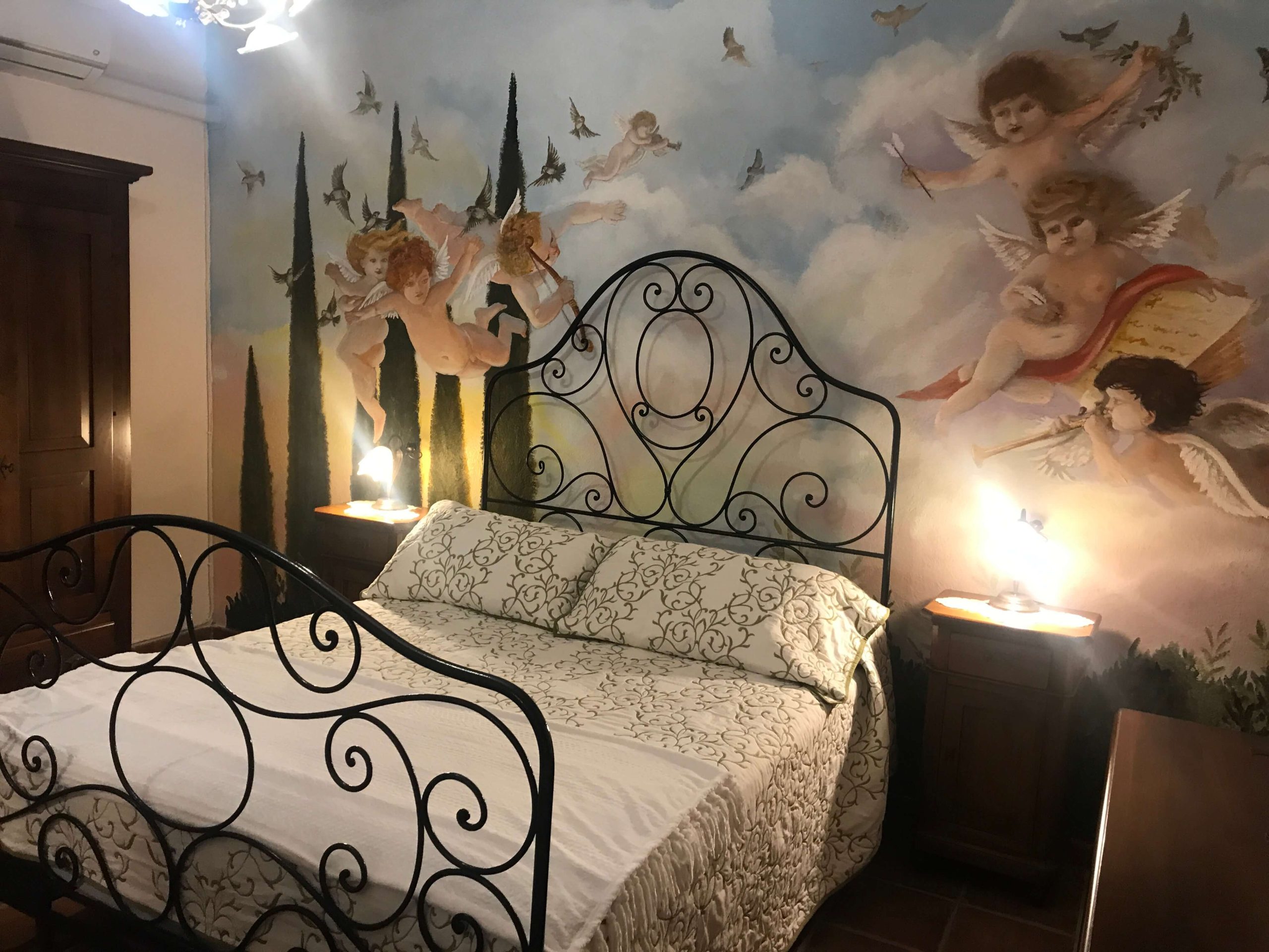 The “Cherubs Symphony” wall painting represents a serene celestial scene: birds filling the air as they do at Casale dell’Amicizia, with Cherubs, playing musical instruments in peaceful harmony, floating in the sky, Depiction in Baroque or Renaissance style. We hope that this peaceful and tranquil scene relaxes you and fills the start of your day with renewed spirit.