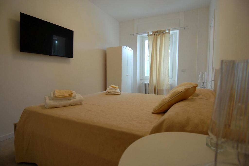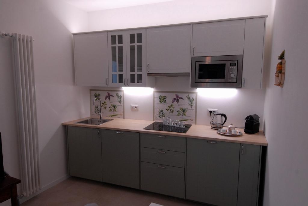 Soggiorno con cucina attrezzata con lavastoviglie, forno, frigo, macchina del caffè, bollitore e TV.