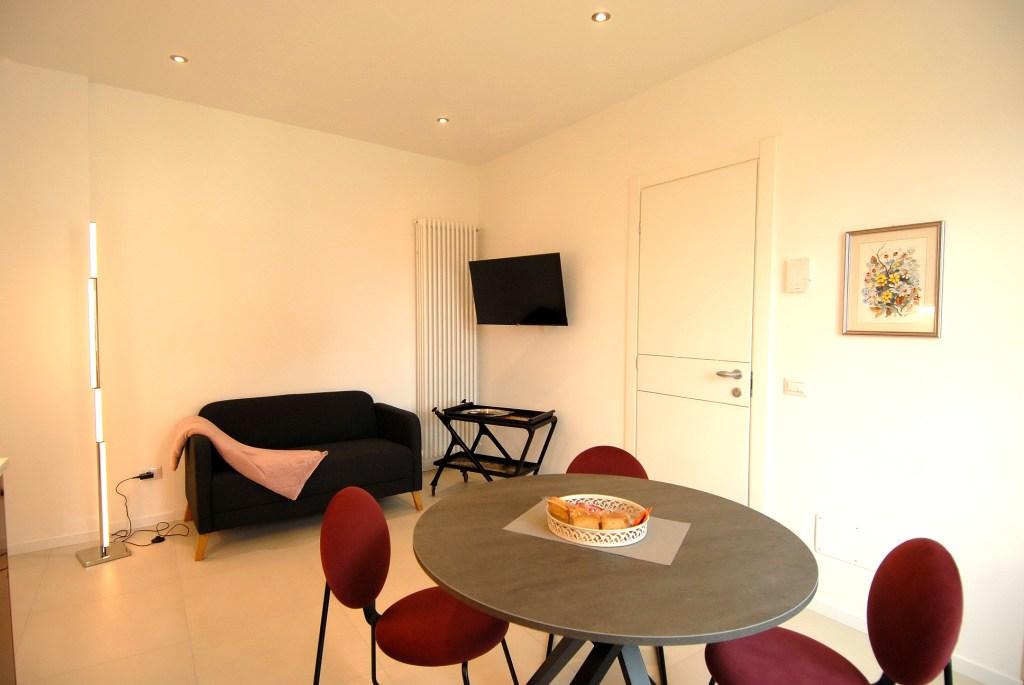 Soggiorno con cucina attrezzata con lavastoviglie, forno, frigo, macchina del caffè, bollitore e TV.